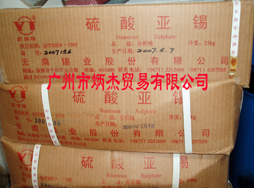 硫酸亞錫又稱硫酸錫,為白色或淺黃色結晶粉末,能溶于水及稀硫酸,水溶液迅速分解。360C時在空氣中會緩慢氧化分解成為堿式鹽,變成微黃色,溶于稀硫酸。常溫在空氣中慢慢氧化成四價錫鹽。酸性溶液穩(wěn)定。分子式: SnSOA; 分子量: 214.7476; 熔點: 360C;水溶性: 330g/L (20C); CAS號: 7488-55-3。